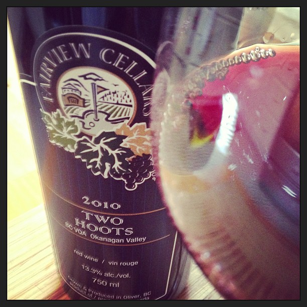 I went to the cellar to find something for the evening and pulled out the Fairview Cellars 2010 Two Hoots Red Wine. While visiting friends in BC, Canada, I had the wonderful opportunity to visit the winery and purchased the bottle for around $24. Alcohol 13.3% by volume. This wine is a blend of 50% Cabernet, 30% Merlot, and 20% Cab Franc. I met the winemaker, Bill Eggert. He gave us a tour of the winery and we tasted through his wines. Two Hoots was named for the Green Horned Owls that come to nest every year on the property.